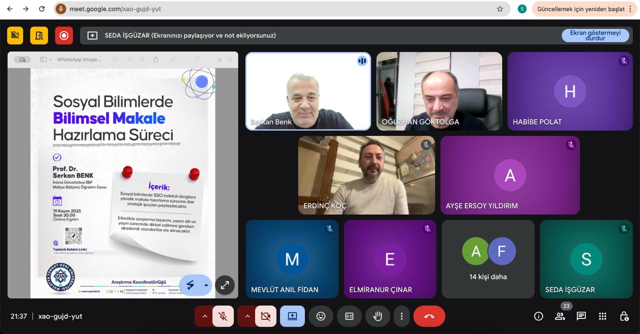 Araştırma Koordinatörlüğümüz tarafından 19.11.2025 tarihinde çevrimiçi olarak üniversitemiz akademik personelinin nitelikli dergilerde makale yayınlama süreçlerine destek olmak amacıyla "Sosyal Bilimlerde Makale Hazırlama Süreci" adlı bir etkinlik gerçekleştirilmiştir. İnönü Üniversitesi Öğretim Üyesi Prof. Dr. Serkan BENK hocamızın katkı sağladığı etkinlikte,