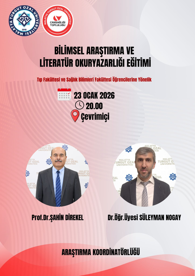 Koordinatörlüğümüz ve Cansağlığı Öğrenci Topluluğu tarafından organize edilen, Tıp Fakültesi ve Sağlık Bilimleri Fakültelerinde öğrenim gören öğrenciler için düzenlenen "Bilimsel Araştırma ve Literatür Okuryazarlığı Eğitimi"ni Doç. Dr. Mehmet AYDOĞAN moderatörlüğünde çevrimiçi olarak gerçekleştirdik. Sağlık Bilimleri Fakültesi Dekanı Sayın Prof. Dr. Şahin DİRİKEL hocamız; Araştırma Süreçleri: Bilimsel bir çalışmaya nereden ve nasıl başlanır? ve Akademik Yazım: Araştırma sürecinde dikkat edilmesi gereken temel ve etik noktalar konularında; Tıp Fakültesi Acil Tıp Bilimleri Anabilimdan Sayın Dr. Öğr. Üyesi Süleyman NOGAY hocamız ise Literatür Taraması: Etkin veri tabanı kullanımı (PubMed, Google Scholar vb.) ve anahtar kelime seçimi; Makale Analizi: Bir bilimsel makale nasıl okunur ve kritik edilir? konularında sunum gerçekleştirdiler. Organizasyona katkı sağlayan Tıp Fakültesi Dekan Yarımcısı Doç.Dr.Feyza İNCEOĞLU'na, Cansağlığı Topluluğu Başkanı Zehra GÖKŞEN'e ve eğitimci hocalarımıza katkılarından dolayı teşekkür ederiz.